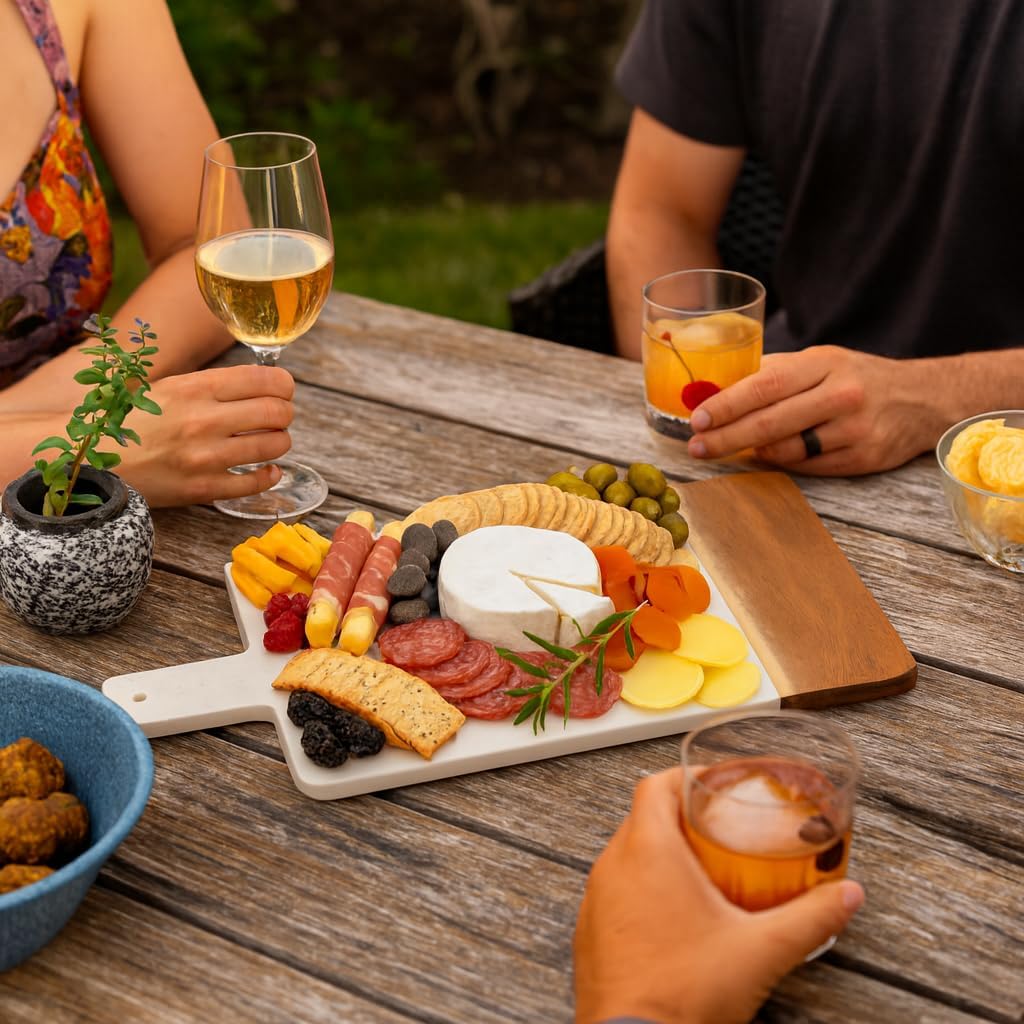 Elevate your entertaining with this personalized charcuterie board gift set, expertly crafted from water-resistant marble and durable acacia wood. Its elegant design features a convenient handle for easy serving and a surface gentle on knives, perfect for slicing and presenting meats, cheeses, fruits, and more. Combining premium materials and practical functionality, this versatile cheese board enhances any kitchen while providing long-lasting use. Ideal for hosts seeking sophistication and utility in one refined piece.
